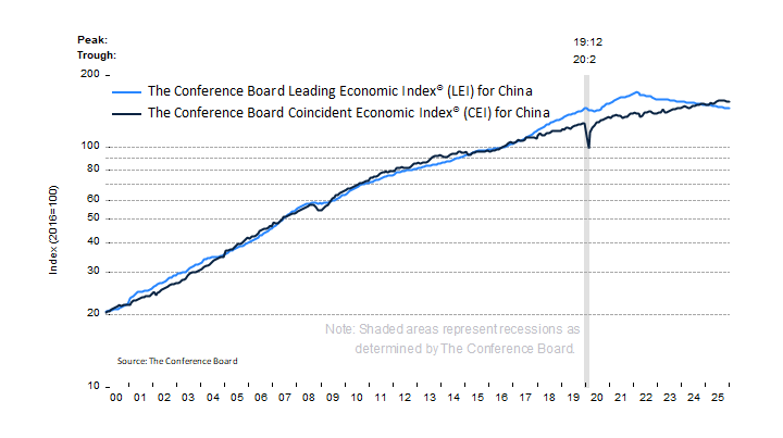 The Conference Board Leading Economic Index®(LEI) for China ticked down by 0.1% in December 2025 to 145.3 (2016=100), after decreasing by 0.2% in November. As a result, the LEI contracted by 1.8% over the second half of 2025, after declining by 1.9% over the previous first half (December 2024 to June 2025).