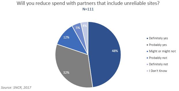Whereas nearly 80 percent of respondents say they would “probably” or “definitely” reduce their level of spend with partners that include unreliable sites, they are ambivalent about joining “private markets,” closed exchanges that include only known and vetted sites. They are split on returning to direct relationships with brand-safe publishers, with 46 percent saying they “probably” would return to premium publishers and another 30 percent saying they were unsure.