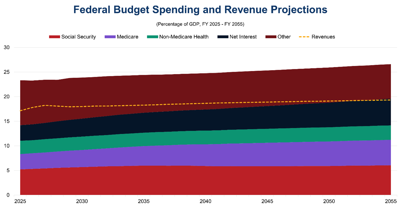 To tackle the United States’ rising national debt (currently exceeding $38 trillion) and ensure the solvency of the primary Trust Funds for Social Security and Medicare, establishing a bipartisan fiscal commission in Congress, composed solely of Members of Congress, to tackle deficits, spending, and the national debt is a promising solution that could break the political impasse surrounding this issue and restore Congressional powers that have eroded over time. To establish a bipartisan fiscal commission, policymakers should consider the following: The national debt is the amount of money the Federal government has borrowed to cover the outstanding balance of expenses incurred over time.1 The national debt is currently over $38 trillion and rose over $2 trillion in 2025.2 Government spending also exceeded revenues by $1.8 trillion in fiscal year (FY) 2025, with spending on Social Security, Medicare, Medicaid, and net interest on the national debt increasing by 8% compared to FY2024.3 Combined with rising costs to service the national debt and the impending insolvency of the Social Security and Medicare Trust Funds over the next decade, the US faces a strongly negative fiscal outlook that, absent immediate action from Federal policymakers, will only continue to worsen.4 Figure 1: Federal Debt Held by the Public as a Percentage of GDP (1900-2055) Sources: The Budget and Economic Outlook: 2025 to 2035, Congressional Budget Office, January 2025; The Conference Board, 2026. Several demographic and economic trends are negatively affecting the long-term outlook for the debt. An aging population, rising health care costs, rising costs of servicing the debt, and lower economic growth and government revenues are all forces that Congress must contend with when addressing the Nation’s fiscal outlook.5 The outsized and unsustainable national debt poses significant challenges to the Federal government, US economy, and society at large—and the costs of inaction are only rising. Fundamentally, high levels of debt increase the cost of servicing the debt, which crowds out other governmental spending priorities.6 If interest rates are elevated at any point, the effect is magnified, as this requires a greater portion of revenues to be used for servicing the debt, forcing a choice between reducing discretionary spending or borrowing even more money—at higher rates—to cover that spending. Figure 2: Health Care Spending and the Cost of Servicing the National Debt Drive Increasing Deficits Over the Next Three Decades Sources: The Budget and Economic Outlook: 2025 to 2035, Congressional Budget Office, January 2025; The Conference Board, 2026. As the debt continues its unsustainable path, financial markets and lenders will lose confidence in the US’ ability to pay it back, especially given long-term demographic and economic trends associated with the status quo. This has multiple effects, particularly on the government’s credit rating, higher interest rates that the Treasury must pay investors to compensate for the greater risk of default, and the value of the US dollar as investors seek safer investments. Higher interest rates could even create a “spiral” or “feedback loop” in which the cost of servicing the debt increases, leading to higher interest rates and further costs to service the debt.7 These effects reduce private investment as financial markets redirect capital to purchasing US debt and rising interest rates make it more difficult for the private sector to obtain capital. Additionally, the government will have to contend with reduced flexibility to address geopolitical events and shocks that can happen at any time, such as national security crises or major disasters. Combined with a loss of confidence in the Federal government’s ability to pay back the debt, confidence in the dollar could weaken, further inhibiting economic growth and driving inflation rates higher.8 Further, while it might once have been possible to argue that the US could simply grow its way out of debt, lower projected growth removes this excuse for inaction and forces the urgency of addressing the debt. Economic growth alone will not address structural challenges in the budget. The Conference Board forecasts that US growth is expected to slow for the remainder of the 2020s and the 2030s—the very period when the debt is projected to rise significantly—due to demographic headwinds and higher structural interest rates.9 All Americans will feel the effects of these hardships. Current retirees and those approaching retirement age (especially those with limited pensions and retirement savings) will be at risk of losing crucial income, health, and long-term care support. Younger generations will also have to bear the burden of paying off the national debt with less fiscal flexibility to address long-term, structural challenges. In short, the high national debt prevents us from investing fully in America’s future. Given the inexorable rise of the national debt over the past 25 years and Congress’s inability to address it to this point through the traditional budget process, a bipartisan fiscal commission provides a new venue to tackle the Nation’s long-term fiscal sustainability. This commission would consist of a core group of Members of Congress, assisted by outside experts, to focus solely on broad solutions to the Nation’s fiscal challenges, giving space for compromise and political cover for Congress to take the difficult votes necessary to reset our fiscal trajectory. A commission also recognizes the current budget process is broken, allows for comprehensive solutions that include action on mandatory spending and revenues, and provides an opportunity to raise public awareness and support—without which success is unlikely. Both business and voters support the concept of a bipartisan fiscal commission. A CED survey of CED Trustee CEOs and Board Directors from September 2023 found that 87% of respo