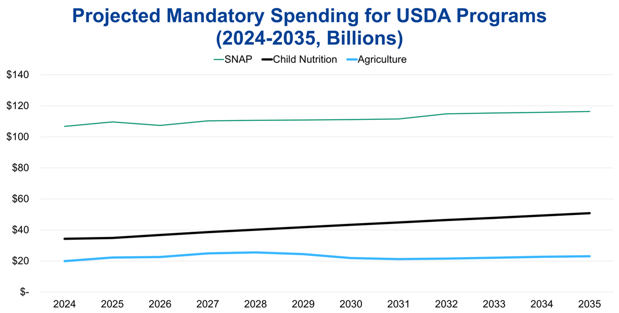 The farm bill authorizes SNAP and other nutrition programs,33 including the Emergency Food Assistance Program,34 which helps supplement the diets of low-income Americans via food assistance delivered by food banks and other local organizations, and the Commodity Supplemental Food Program,35 which provides monthly food packages to low-income seniors. CBO projects baseline Nutrition program outlays authorized in the farm bill to total $1.1 trillion between FY2025 and FY2034,36 and Federal spending on USDA’s food and nutrition assistance programs totaled $142 billion in FY2024.37