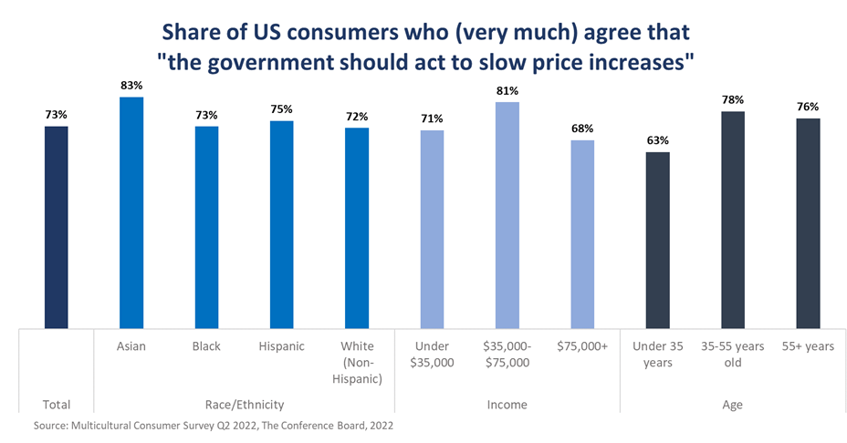 Regardless of race, income or age, our 2Q 2022 Multicultural Survey of 2000 Americans reveals that an overwhelming majority of US consumers canvassed believe the US government should do something to lower inflation. According to the latest inflation reports (BLS, BEA), prices are rising the fastest for food, energy, and shelter—all household necessities. Additionally, for those who like to have a bit of fun, costs for services like flights, hotels, restaurants, movies, streaming, and cell phones are also going up rapidly. But what can the government do? Indeed, some drivers of rising prices are outside of the realm of the current administration or central bank to tackle, but they are not without ammunition.