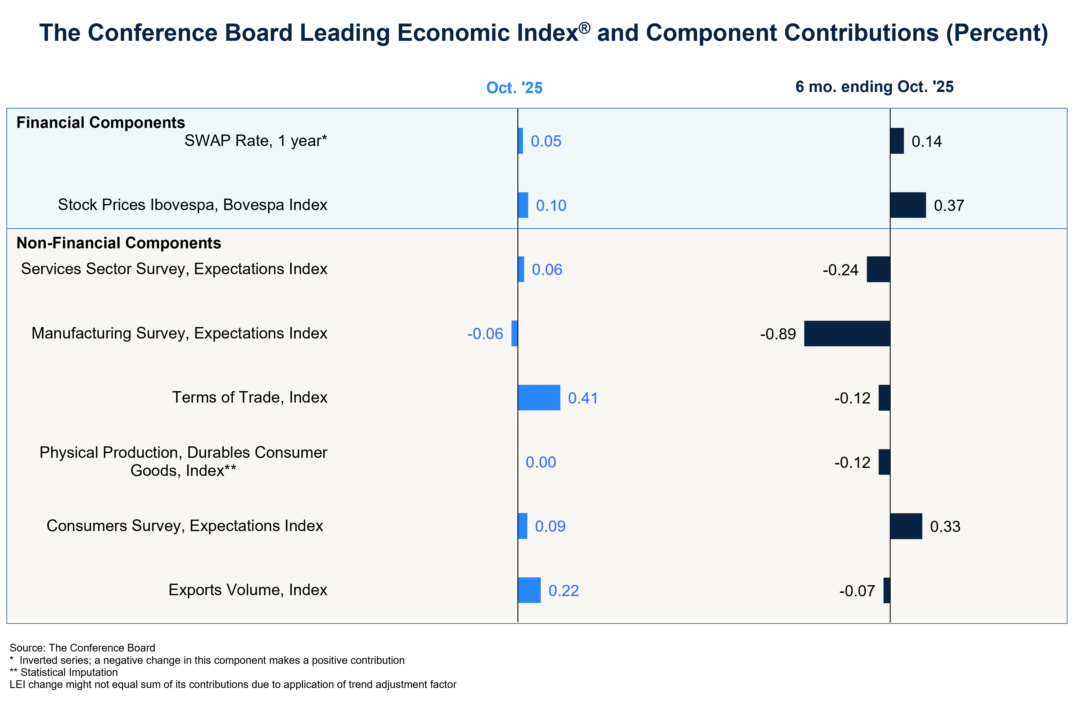 The Conference Board Leading Economic Index® (LEI) for Brazil, together with Fundação Getulio Vargas, increased by 0.9% in October 2025 to 121.1 (2016=100), after a 0.8% increase in September. The LEI also increased by 0.7% over the six-month period between April and October 2025, partially reversing contraction of 2.4% over the previous six-month period between October 2024 and April 2025.