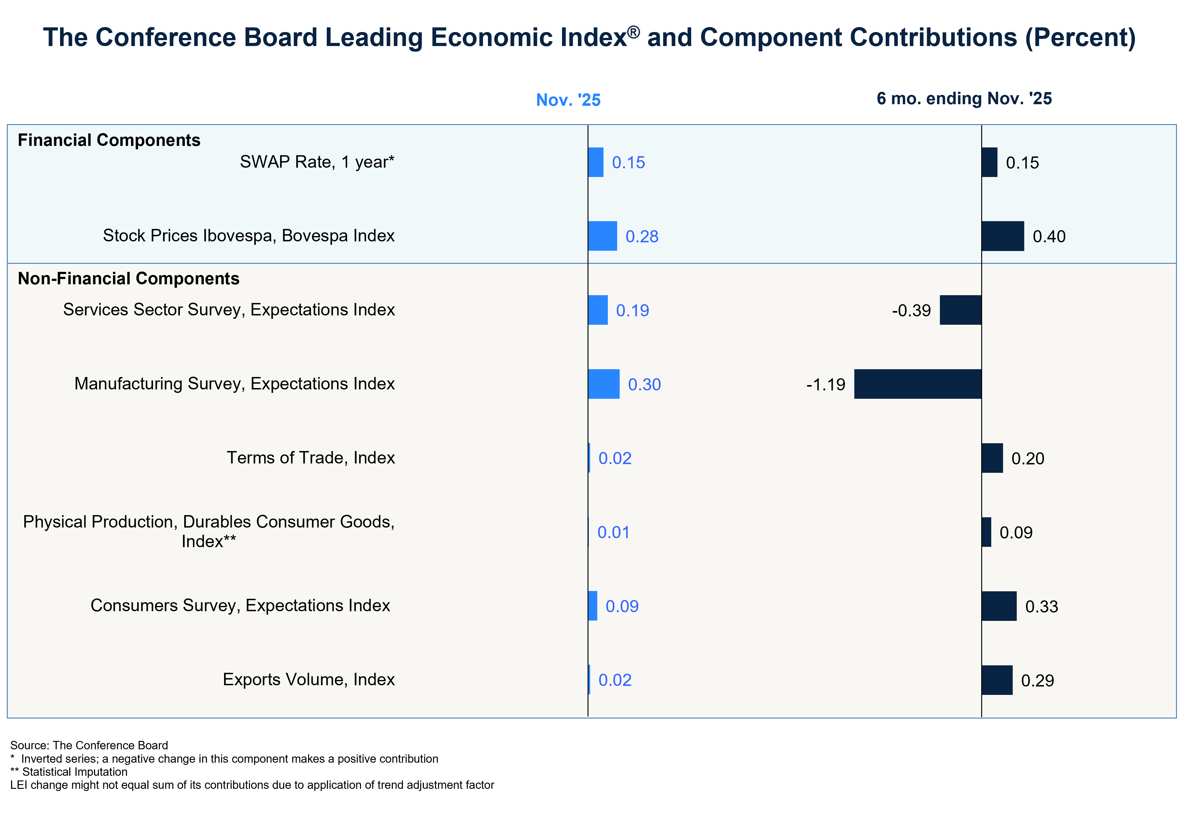 The Conference Board Leading Economic Index® (LEI) for Brazil, together with Fundação Getulio Vargas, rose by 1.1% in November 2025 to 122.4 (2016=100), after a 0.9% increase in October. As a result of the past 3 months of substantial consecutive increase, the LEI expanded by 1.3% over the six-month period between May and November 2025, partially compensating the 2.0% contraction over the previous six-month period between November 2024 and May 2025.