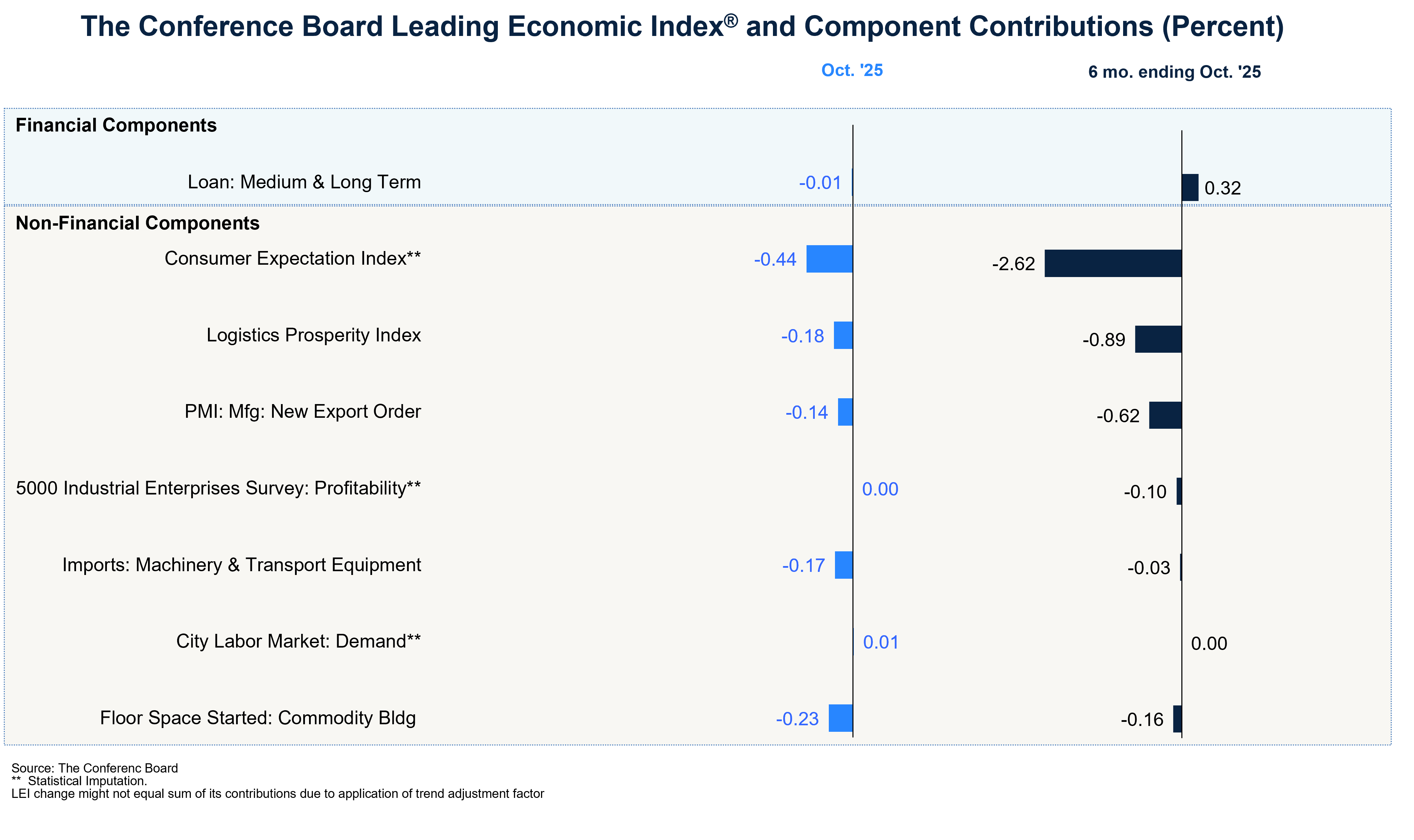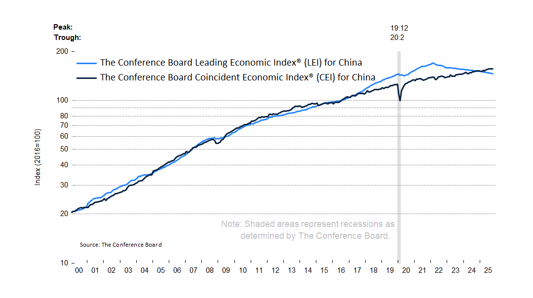 The Conference Board Leading Economic Index®(LEI) for China declined by 0.8% in October 2025 to 145.6 (2016=100), after decreasing by 0.1% in September. As a result, the LEI contracted by 2.0% over the six-month period from April to October 2025, continuing a 1.7% decline over the previous six-month period between October 2024 and April 2025.