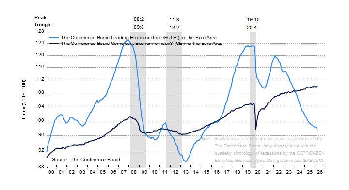 The Conference Board Leading Economic Index®(LEI) for the Euro Area decreased by 0.5% in March 2026 to 97.8 (2016=100), after declining by 0.1% in February. Due to persistent weakening over the last seven months, the LEI contracted by 1.1% over the six-month period from September 2025 to March 2026, but at a smaller rate than the 2.1% decline experienced over the previous six-month period, from March to September 2025.