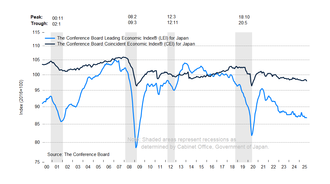 The Conference Board Leading Economic Index®(LEI) for Japan declined by 0.1% in September 2025 to 86.8 (2016=100), reversing a 0.1% increase in August (downwardly revised from 0.3%). Over the six-month period between March and September 2025, the LEI for Japan also declined by 1.8%, which is a deterioration from a 1.3% growth between September 2024 and March 2025.