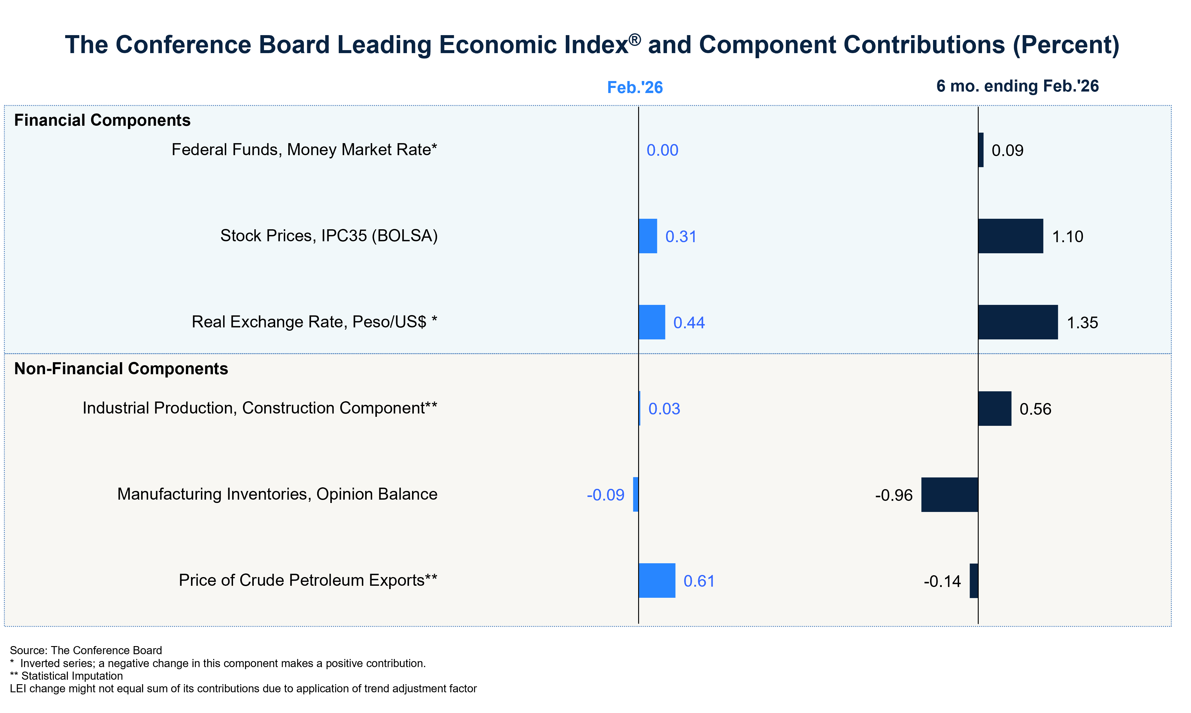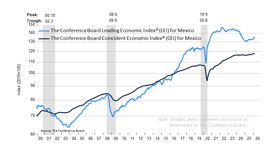The Conference Board Leading Economic Index®(LEI) for Mexico increased by 1.3% in February 2026 to 135.8 (2016=100), after increasing by 0.4% in January. Overall, the LEI expanded by 2.4% over the six-month period between August 2025 to February 2026, a much faster rate compared to the 0.8% growth over the previous six-month period between February and August 2025.