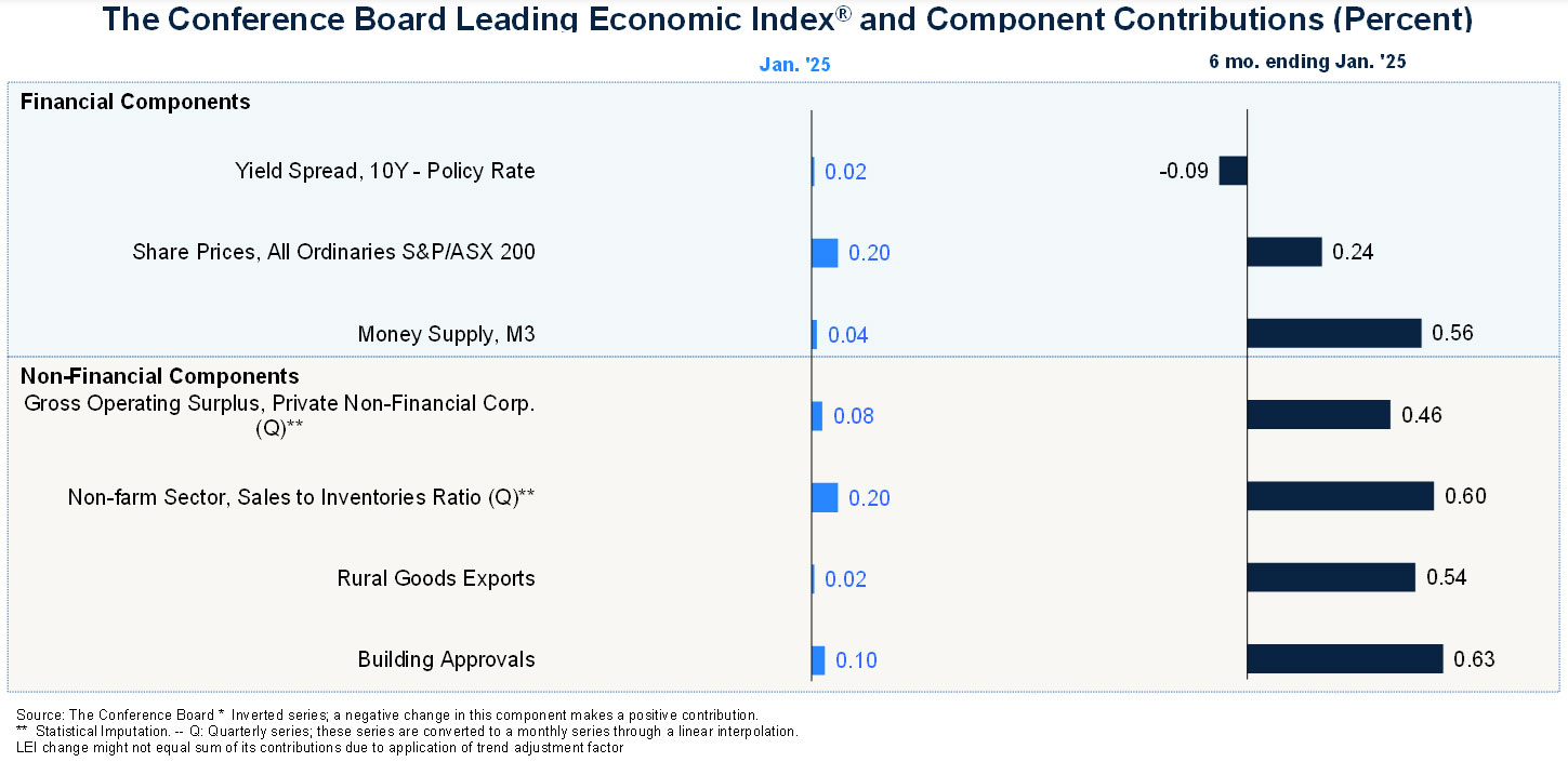 “The LEI for Australia increased for a fifth consecutive month in January,” said Ian Hu, Economic Research Associate at The Conference Board. “All components contributed to the increase of the Index, with share prices and the sales-to-inventories ratio contributing the most. Additionally, the six-month and annual growth rates of the LEI continued to improve; the annual growth rate was only barely negative in January, suggesting that headwinds to growth have largely dissipated. GDP growth strengthened to 2.4% (quarter on quarter annualized) in the Q4 of last year. In addition, China’s growing appetite for Australian mineral ores (supported by government stimulus measures) is also likely to support economic expansion in the near future. Against this background, The Conference Board currently forecasts that Australia’s annual real GDP will grow by 1.7% in 2025 after 1% in 2024.”