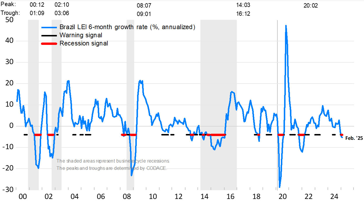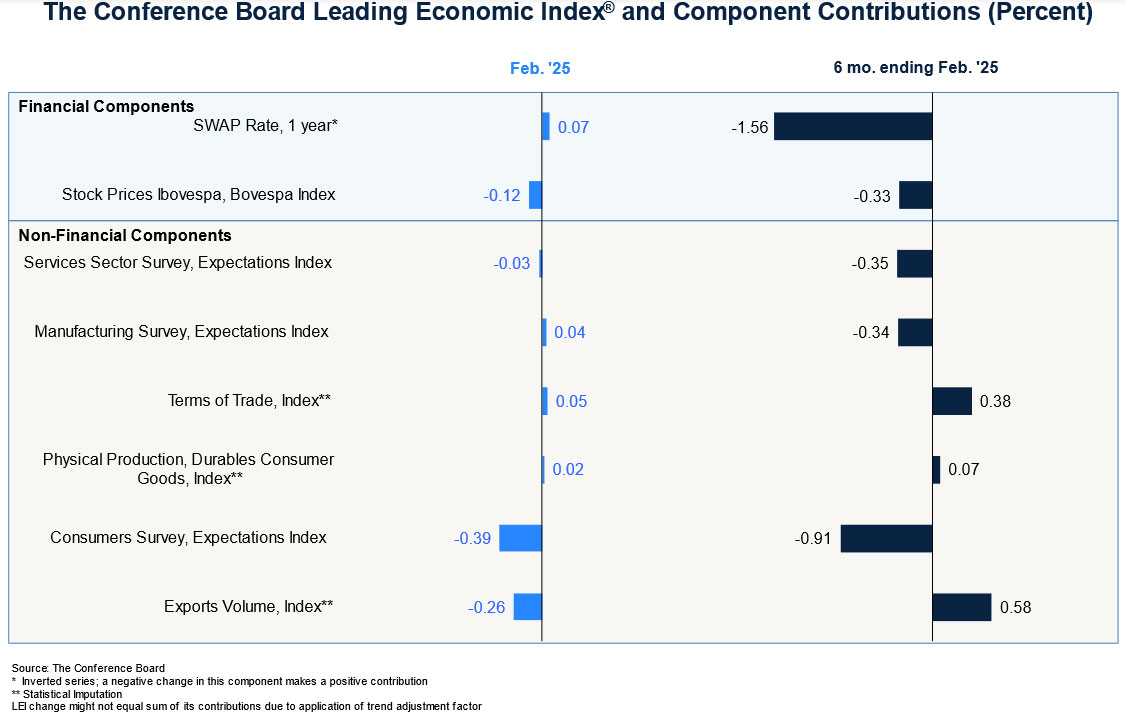 The Conference Board Leading Economic Index® (LEI) for Brazil, together with Fundação Getulio Vargas, decreased by 0.5% in February 2025 to 120.2 (2016=100), following a decline of 0.2% in January. As a result, the LEI contracted by 2.7% over the six-month period between August 2024 and February 2025, more than reversing the 0.7% expansion over the previous six-month period.
