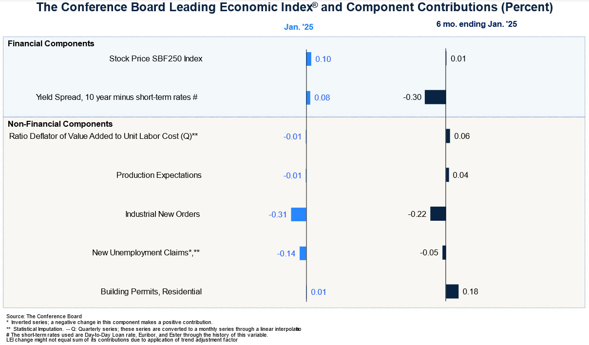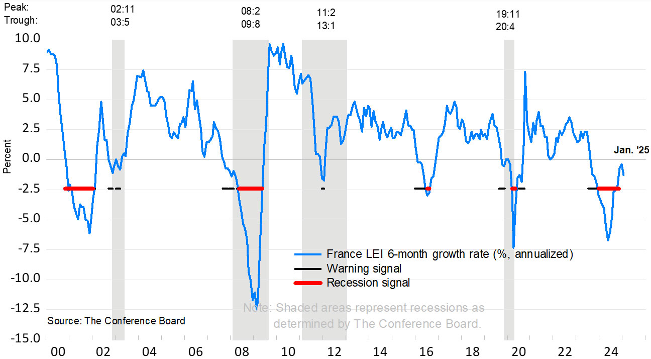 “After remaining largely flat in the second half of 2024, the France LEI declined at the start of 2025,” said Allen Li, Associate Economist at The Conference Board. “In January, financial components improved, but non-financial ones weakened, led by industrial new orders and new unemployment claims. This likely reflected economic and political uncertainties present at the end of last year and going into 2025. After being relatively stable in the second half of 2024, the six-month growth trajectory of the France LEI cooled slightly with the latest monthly pullback. However, it remains well above the threshold signaling a recession and there were more strengths than weaknesses among its components over the past 6 months. Overall, the LEI suggests a slowdown in growth that is potentially due to a multitude of headwinds, including fiscal spending cuts and tax hikes, which are likely to weigh on business confidence and investment, along with trade uncertainties around US tariffs and slower global growth. The Conference Board currently forecasts France GDP growth to slow to 0.5% in 2025, downwardly revised from 0.7%, from 1.1% in 2024.”