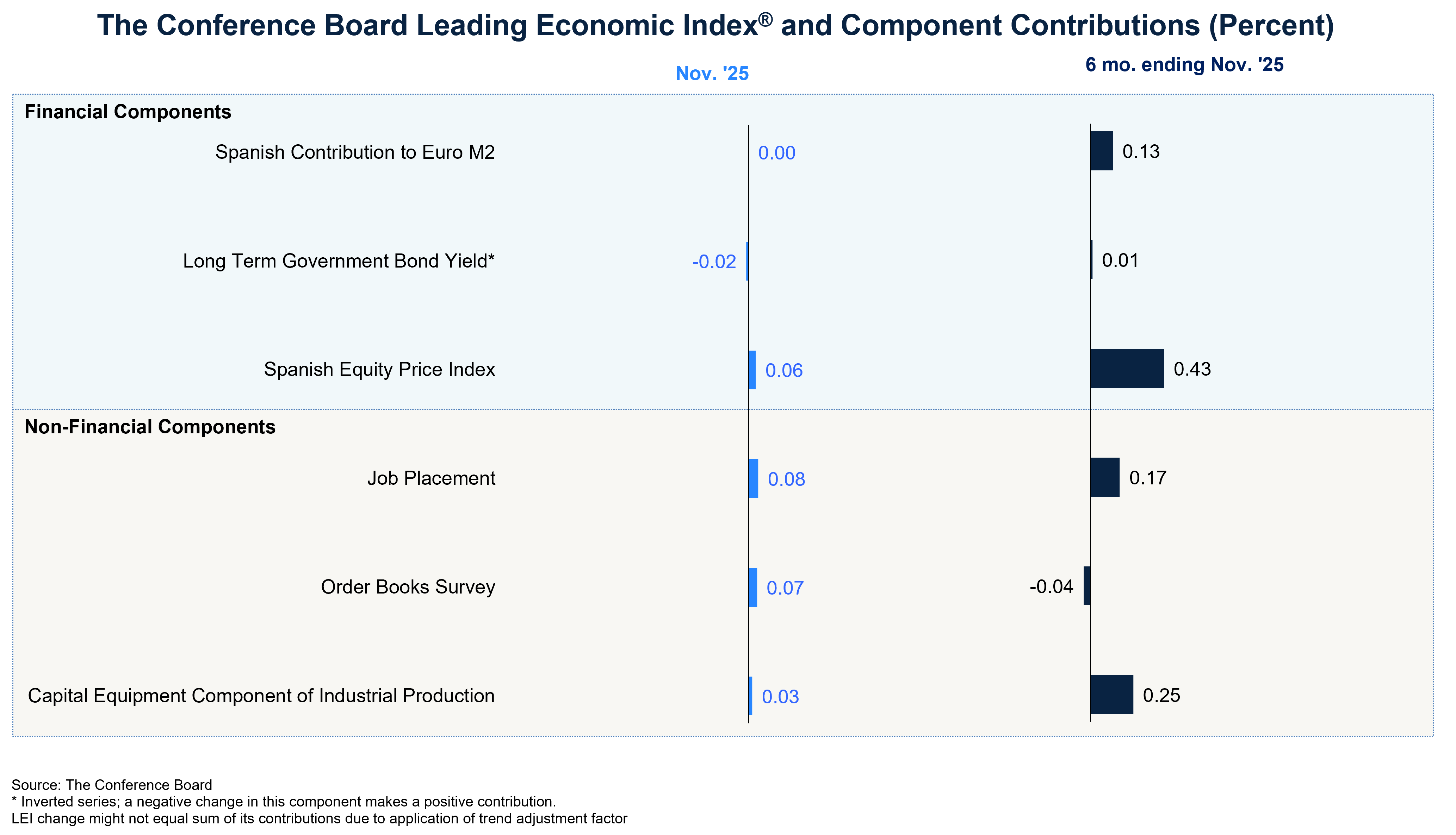 The Conference Board Leading Economic Index® (LEI) for Spain increased by 0.2% in November 2025 to 102.5 (2016=100), after a 0.1% increase in October. Overall, the Spain LEI expanded by 0.9% over the six-month period between May and November 2025, accelerating slightly from a 0.7% increase over the previous six-month period, between November 2024 and May 2025.