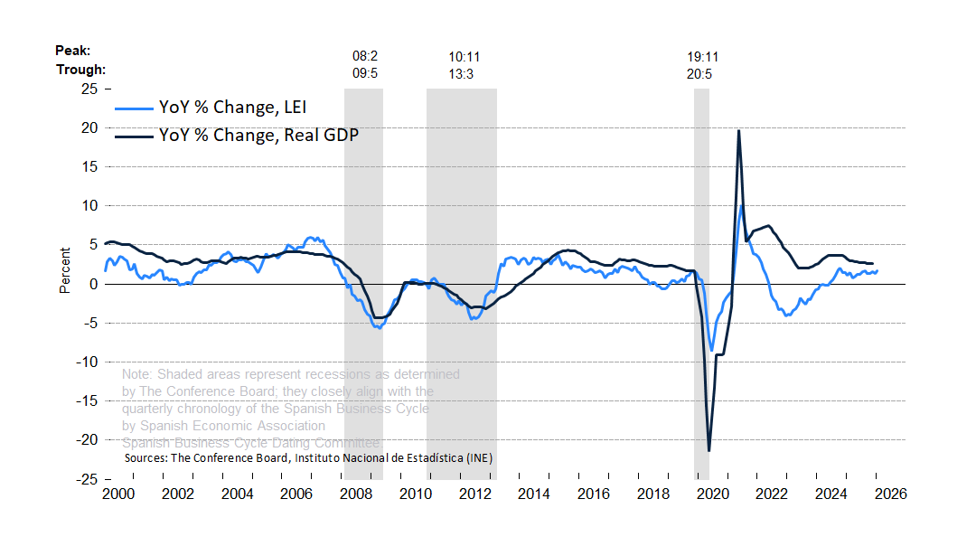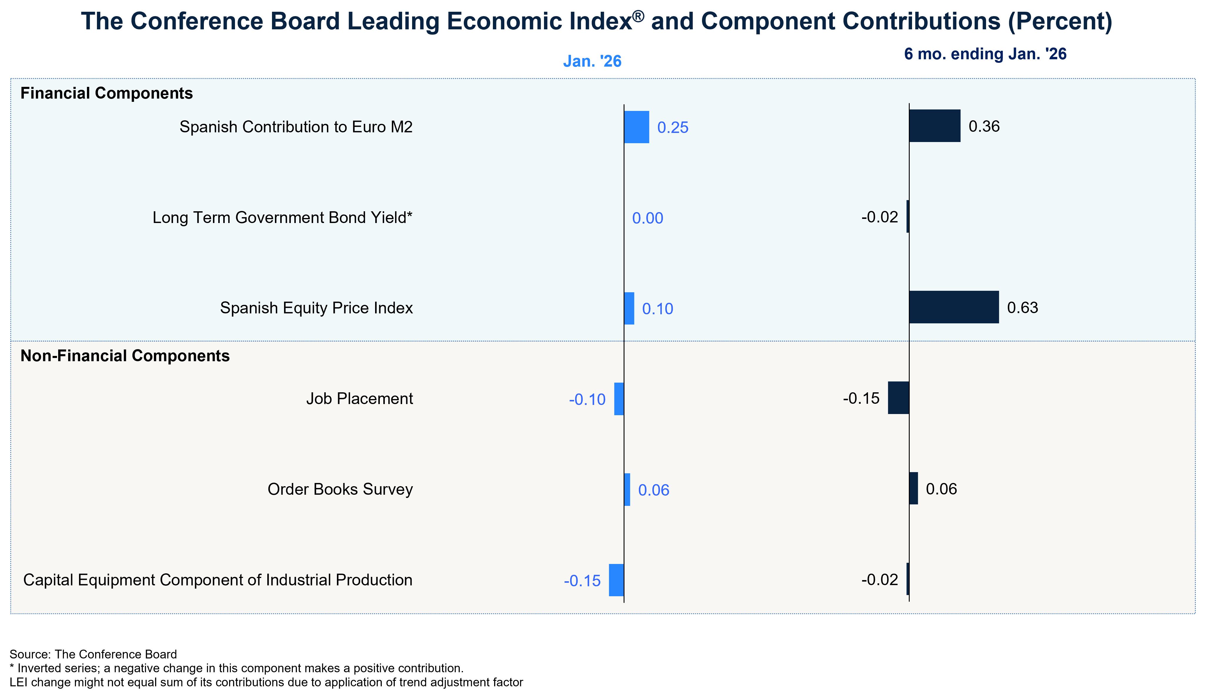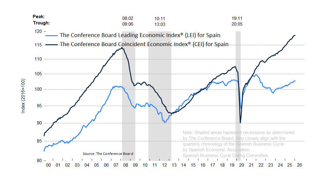 The Conference Board Leading Economic Index® (LEI) for Spain increased by 0.2% in January 2026 to 102.8 (2016=100), after increasing by 0.1% in December. Overall, the Spain LEI expanded by 0.8% from July 2025 to January 2026, only slightly less than the 0.9% increase over the previous six-month, between January and July 2025.