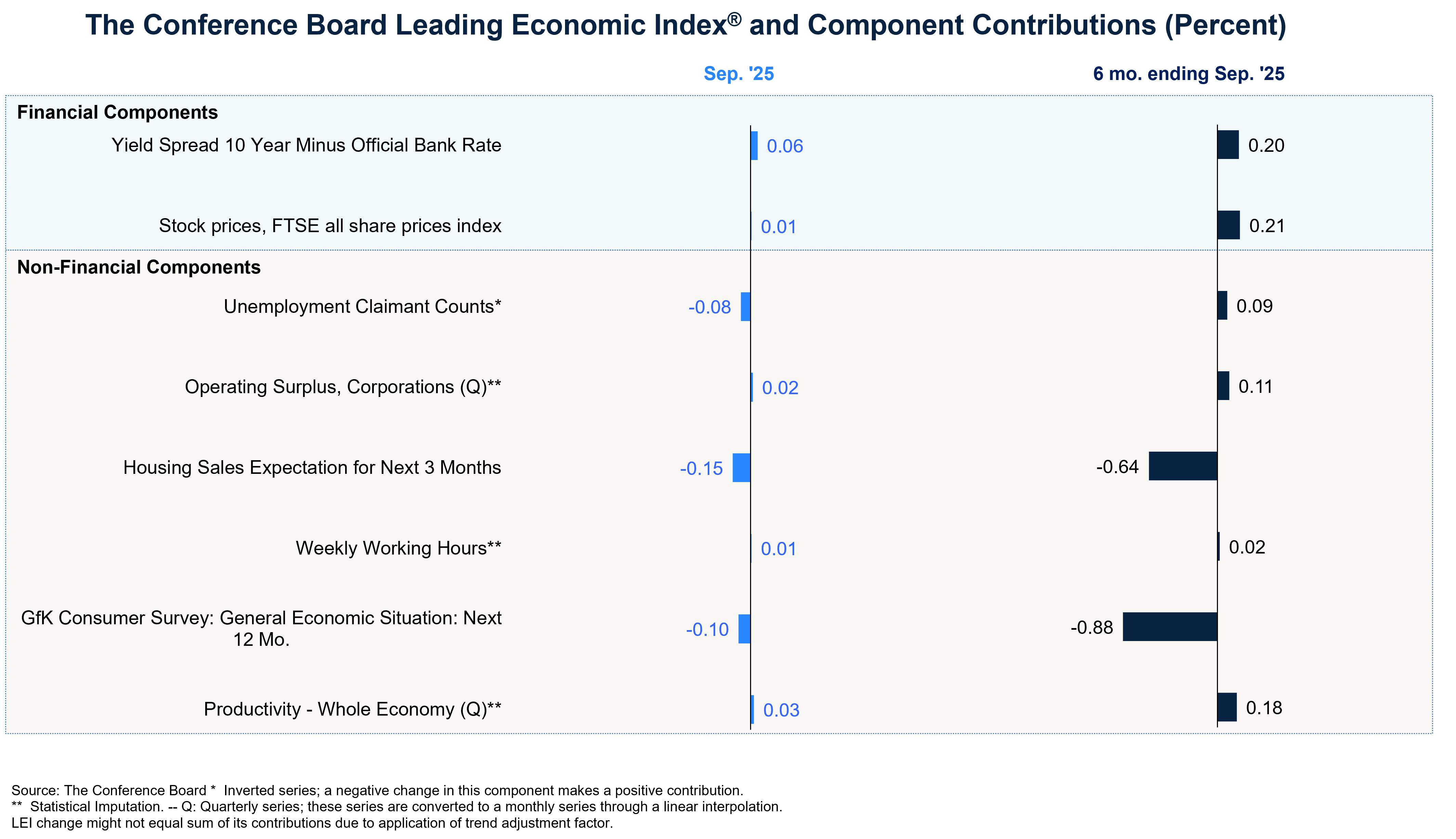 The Conference Board Leading Economic Index® (LEI) for the United Kingdom contracted by 0.3% in September 2025 to 74.2 (2016=100), after decreasing by 0.1% in August. As a result, the UK LEI decreased by 1.1% over the six-month period from March to September 2025, a slightly lower rate of decline than the -1.2% over the previous six-month period between September 2024 and March 2025.