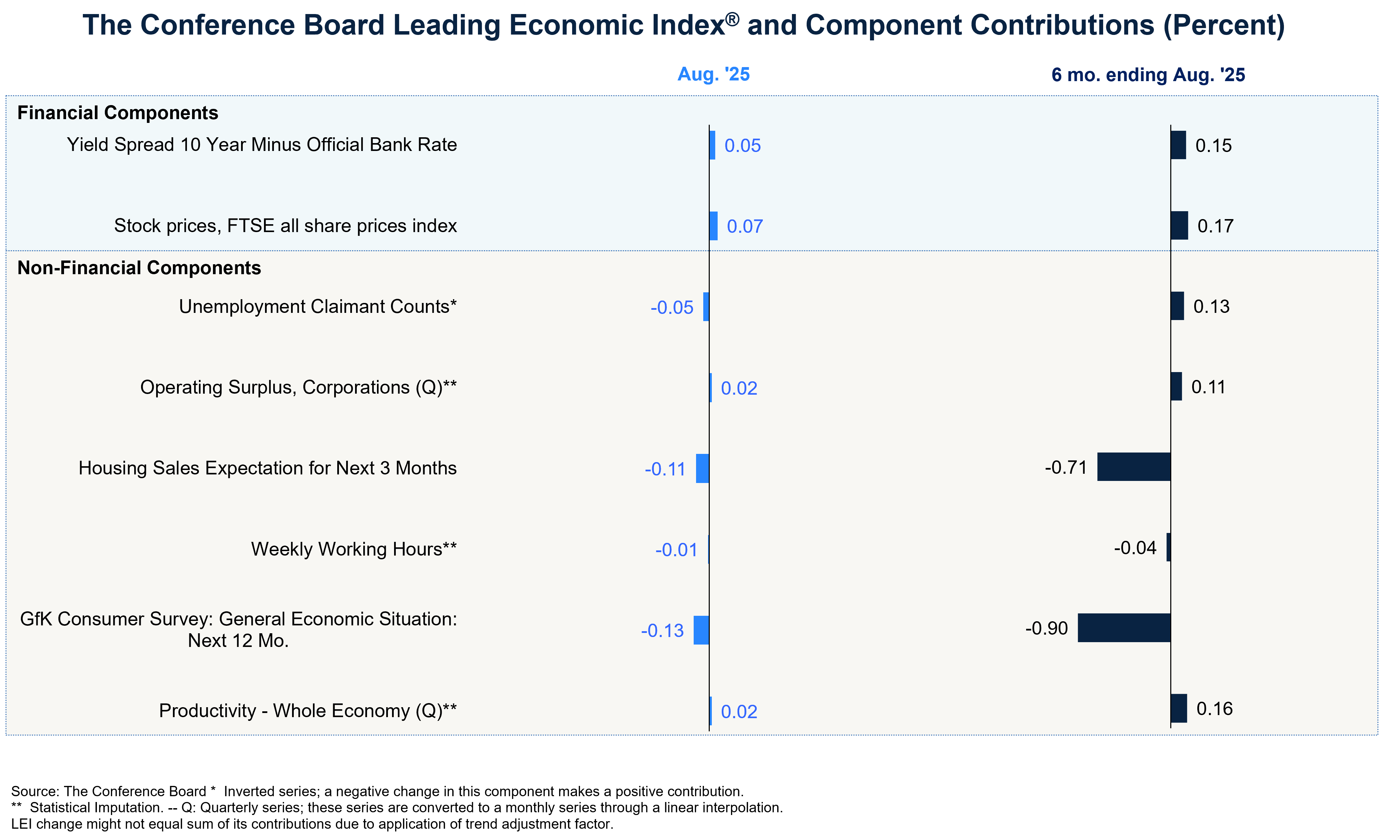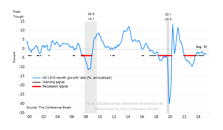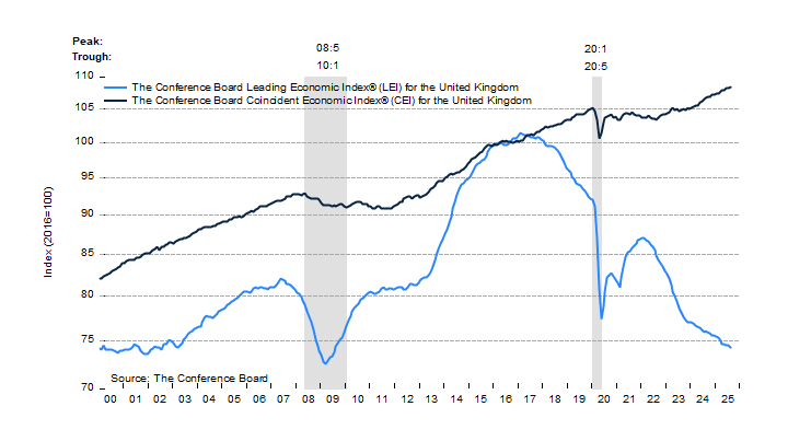 The Conference Board Leading Economic Index® (LEI) for the United Kingdom contracted by 0.3% in August 2025 to 74.3 (2016=100), after no change in July. As a result, the UK LEI decreased by 1.3% over the six-month period from February to August 2025, a higher rate of decline than the -1.1% over the previous six-month period between August 2024 and February 2025.