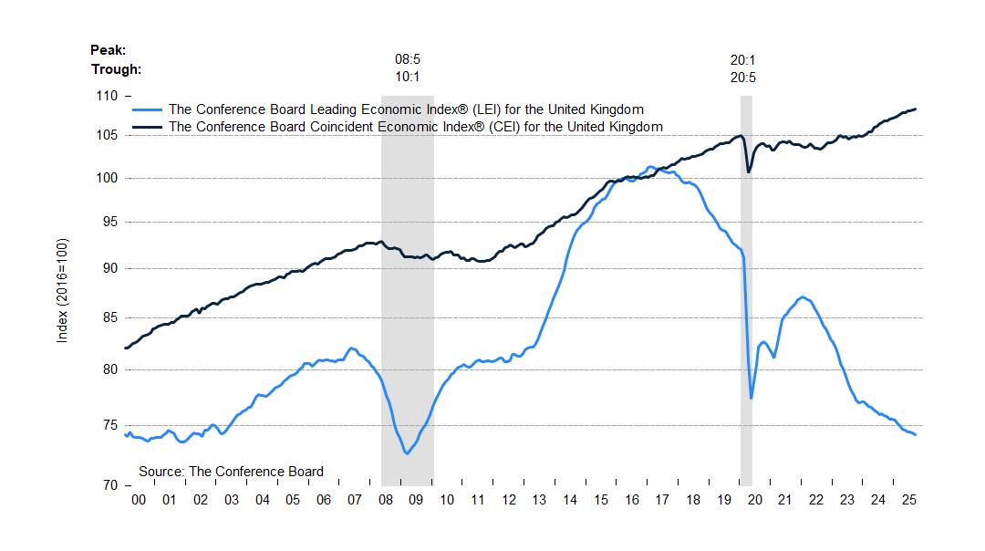 The Conference Board Leading Economic Index® (LEI) for the United Kingdom contracted by 0.3% in September 2025 to 74.2 (2016=100), after decreasing by 0.1% in August. As a result, the UK LEI decreased by 1.1% over the six-month period from March to September 2025, a slightly lower rate of decline than the -1.2% over the previous six-month period between September 2024 and March 2025.